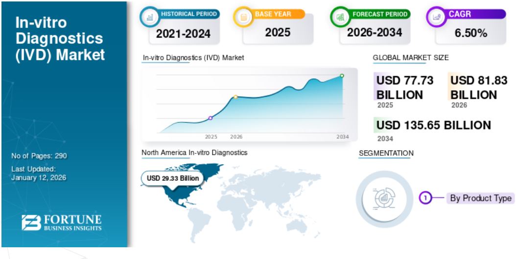 PUNE, INDIA, February 7, 2026 /EINPresswire.com/ -- The global in-vitro diagnostics (IVD) market was valued at USD 77.73 billion in 2025 and is projected to grow from USD 81.83 billion in 2026 to USD 135.65 billion by 2034, exhibiting a CAGR of 6.50% during the forecast period. North America dominated the in-vitro diagnostics market with a market share of 37.70% in 2025.In-vitro diagnostics include medical tests performed on biological samples such as blood, urine, saliva, and tissue to detect diseases, monitor therapy, and guide clinical decision-making. IVD tests influence nearly 70% of medical decisions, highlighting their critical role in modern healthcare. As healthcare systems increasingly shift toward value-based care and personalized medicine, the importance of reliable and rapid diagnostic testing continues to rise, strengthening long-term demand for IVD solutions.