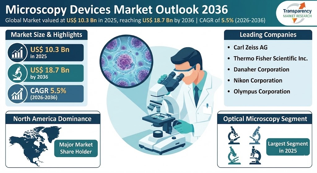 WILMINGTON, DE, UNITED STATES, February 10, 2026 /EINPresswire.com/ -- The global microscopy devices market was valued at US$ 10.3 billion in 2025 and is projected to reach US$ 18.7 billion by 2036, expanding at a compound annual growth rate (CAGR) of 5.5% from 2026 to 2036. This steady growth is driven by rapid advancements in imaging technologies, rising investments in life sciences research, increasing demand for early disease diagnosis, and expanding applications across healthcare, biotechnology, materials science, and industrial inspection.— Transparency Market Research